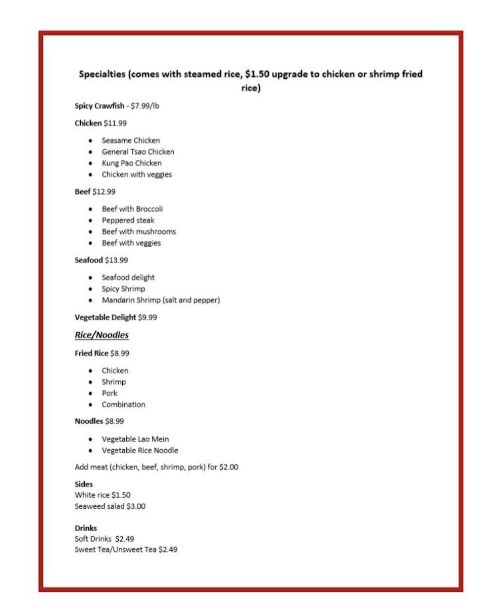The menu at China Harbor offers a balanced mix of classic Asian dishes and comforting buffet-style favorites, creating a casual and approachable dining experience. From satisfying plates like sesame chicken and spicy crawfish to simple bites such as fried rice and chicken wings, the variety appeals to both those looking for a quick meal and those wanting to linger over familiar flavors.